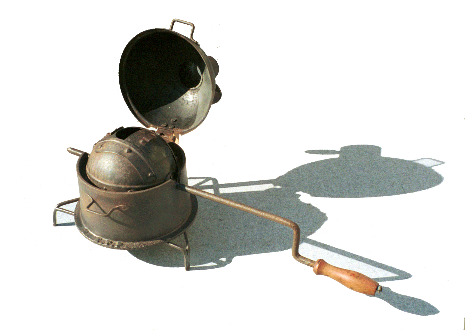 Posé sur la cuisinière à la place des ronds, à même les braises, le grilloir à café permettait de torréfier les grains de café verts soi-même à la maison en grande quantité.