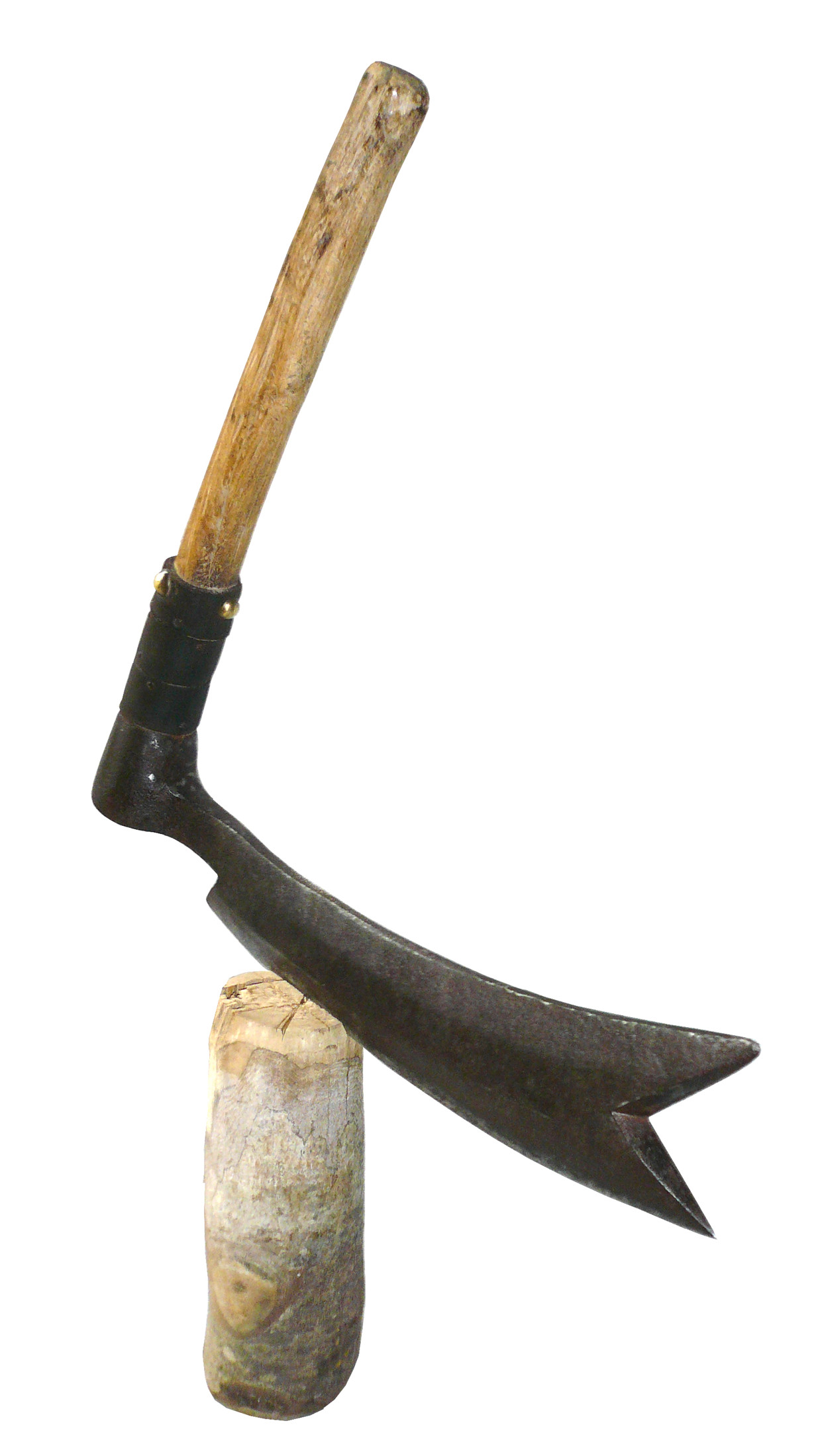 Son fer est constitué d'une lame acérée, légèrement courbée, au tranchant comportant un seul biseau. Sa plus forte épaisseur forme une nervure qui court au milieu de toute sa longueur.