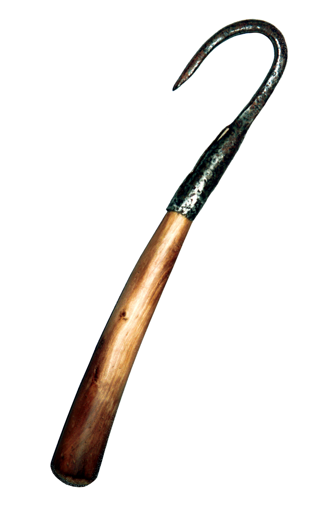 C'est un instrument en fer emmanché court et dont l'extrémité est terminée par une pointe recourbée. Il est utilisé pour accrocher les fardeaux difficiles à saisir à la main.