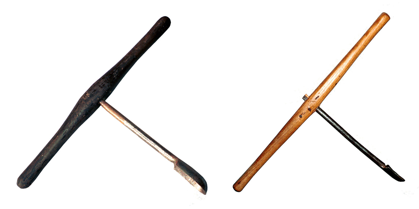 A gauche : cuillère de charron ; à droite : cuillère de sabotier.