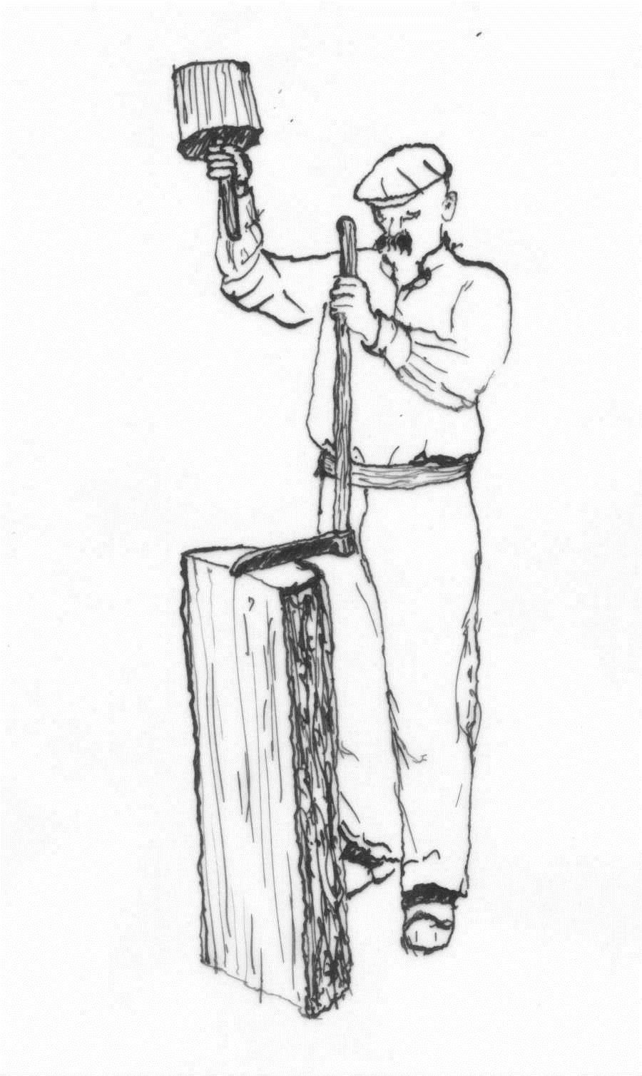L'outil n'est pas jeté, mais il est posé sur le bois. Il est maintenu en place de la main gauche. Pour le faire pénétrer, il reçoit les coups du maillet, frappés de la main droite sur son dos. Le fendeur de merrains doit faire avancer son outil jusqu'à l'autre extrémité sans casser les fibres, c'est pourquoi il donne au manche un mouvement de rotation accompagné d'un léger balancement, pour séparer selon le fil (les mailles).