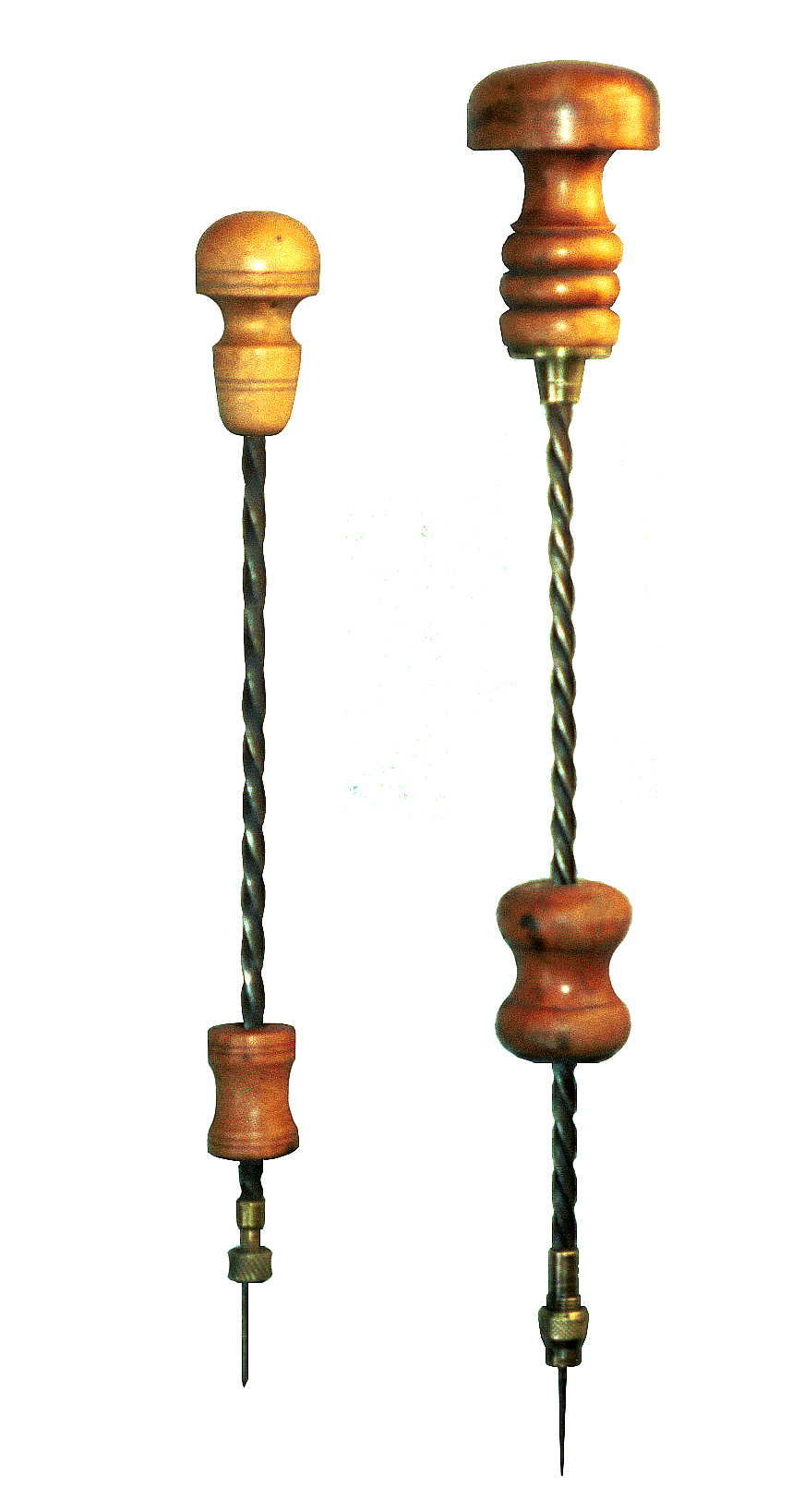 Le premier outil de perce était constitué d'une pierre taillée en pointe et emmanchée au bout d'une tige en bois que l'on faisait tourner, par friction, entre les paumes des deux mains.