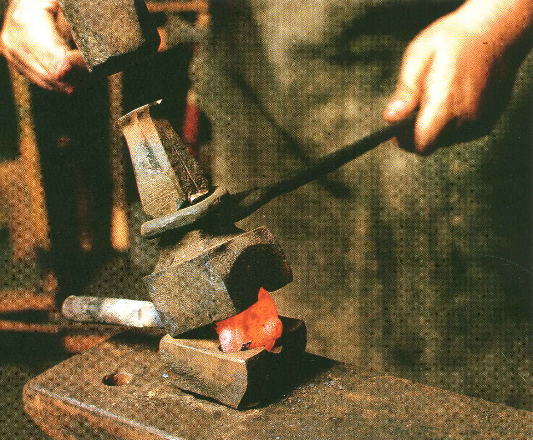 Le travail à l'enclume se fait à deux ouvriers. On place la contre-étampe dans l'œil de l'enclume. Le forgeron y maintient dessus la pièce qui doit recevoir son empreinte. Il pose sur cette pièce rouge l'étampe à manche de même profil. Son aide, placé en face, donne de vigoureux coups sur cette contre-étampe avec le marteau à devant, le métal se déforme et vient épouser les contours de l'empreinte.