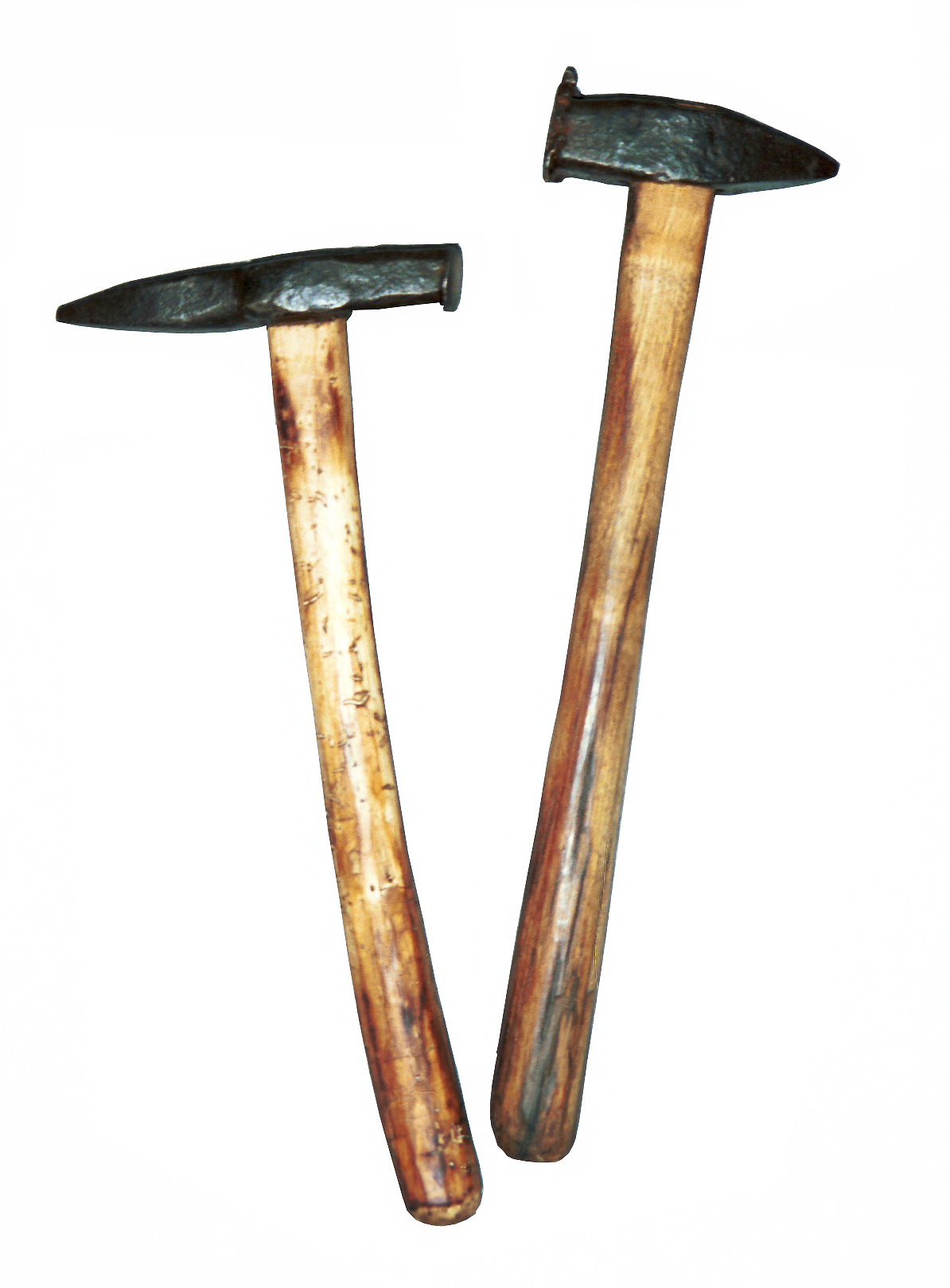 Après avoir déposé avec sa pince le fer rouge sur l'enclume, le maréchal présente, de sa main gauche, l'étampe à l'emplacement souhaité, et, tenant de l'autre main un marteau, il frappe dessus pour faire l'étampure.