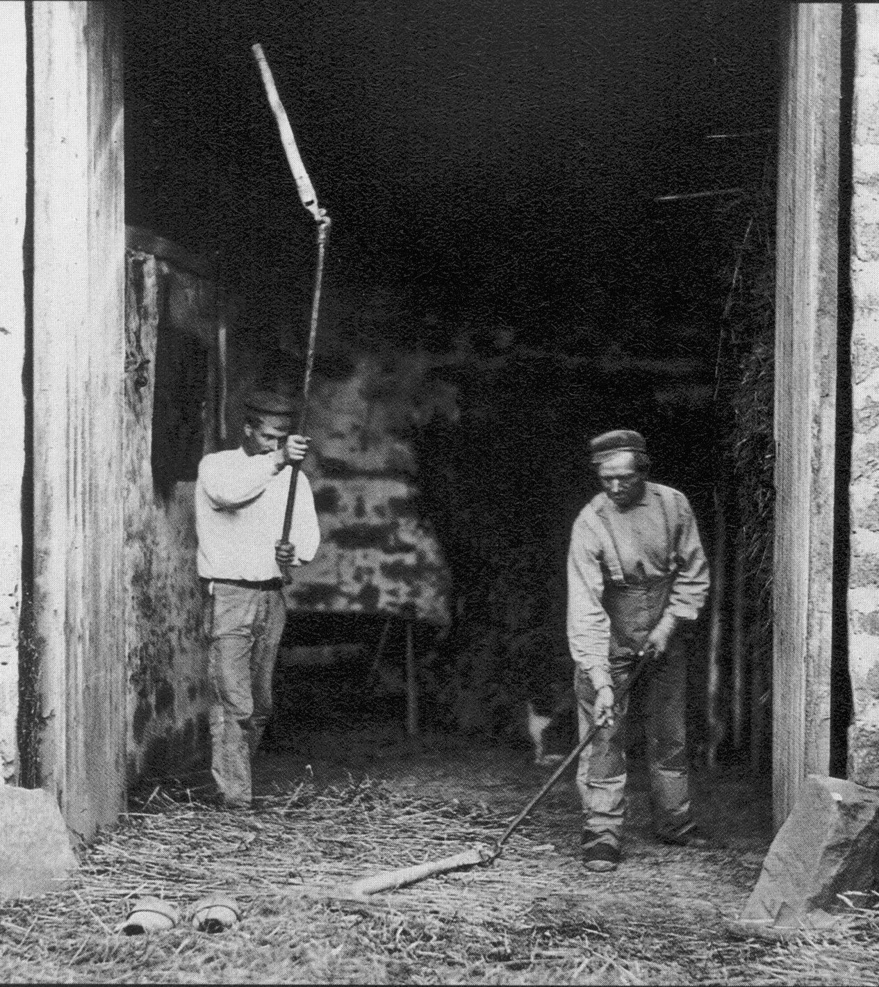 C'est avec cet outil rudimentaire, dont le maniement paraît simple, que l'on effectue l'égrenage en frappant, avec la batte, les épis déposés sur le sol. Ce travail s'effectue presque toujours dans la grange.