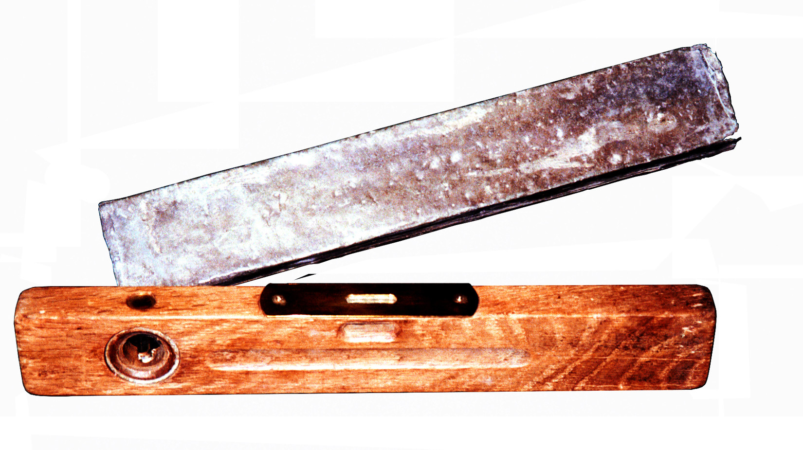 Sur la photo on peut voir un niveau à bulle d'air de maçon, avec son étui de protection en zinc.