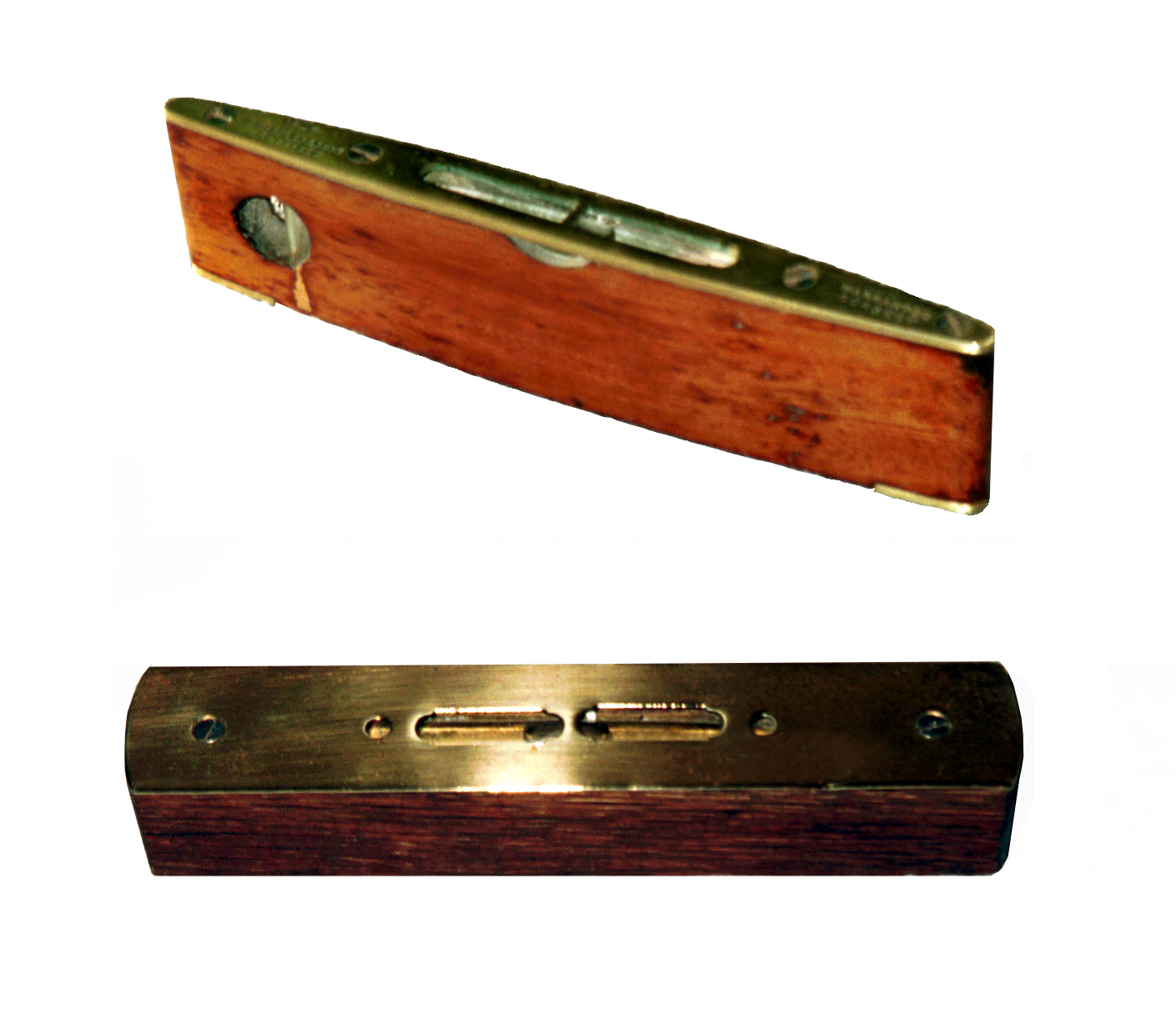 Le niveau du haut sur la photo, de fabrication anglaise, est en acajou, garni d'une plaque de protection en laiton.