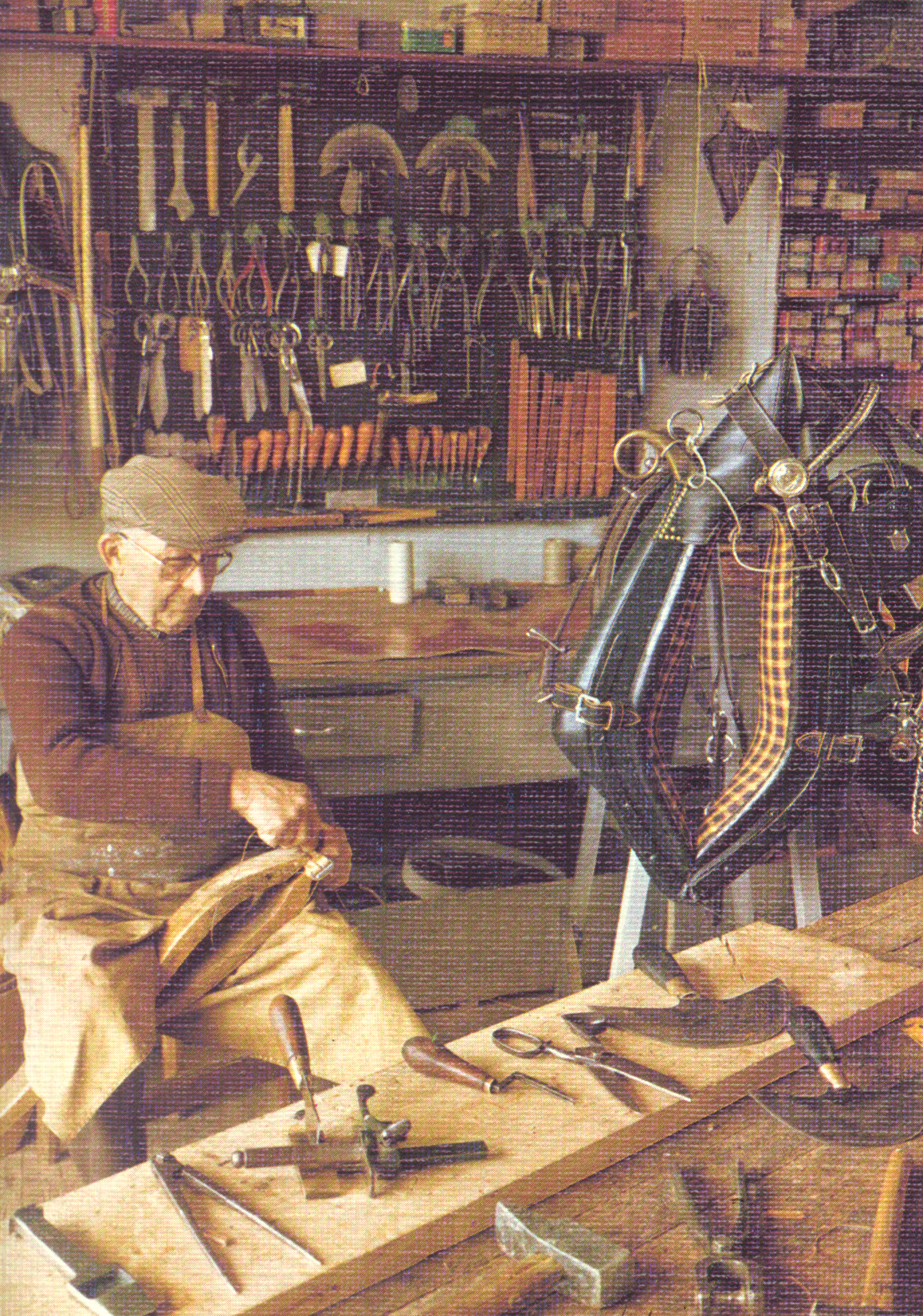 L'artisan, assis sur une chaise, serre entre ses cuisses les branches de la pince, qui maintiennent fermement les pièces à coudre placées entre ses mâchoires.