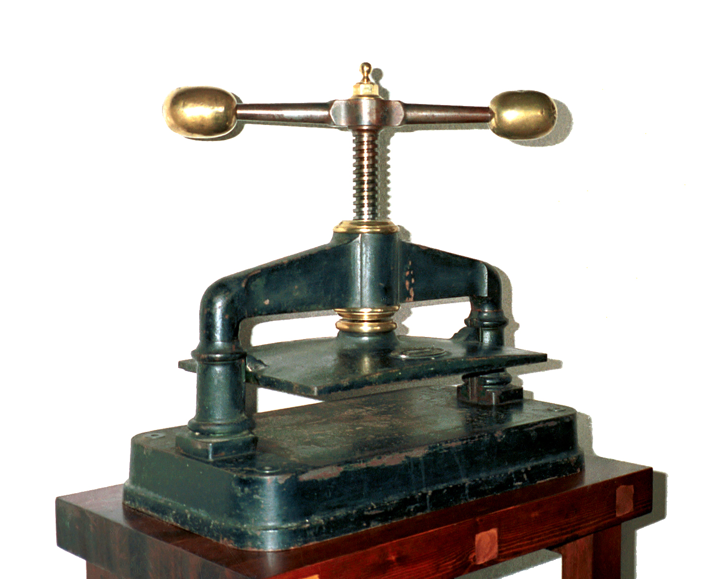 Cette presse est maintenant utilisée par des relieurs pour comprimer les ouvrages à diverses phases de l'avancement de leur travail.