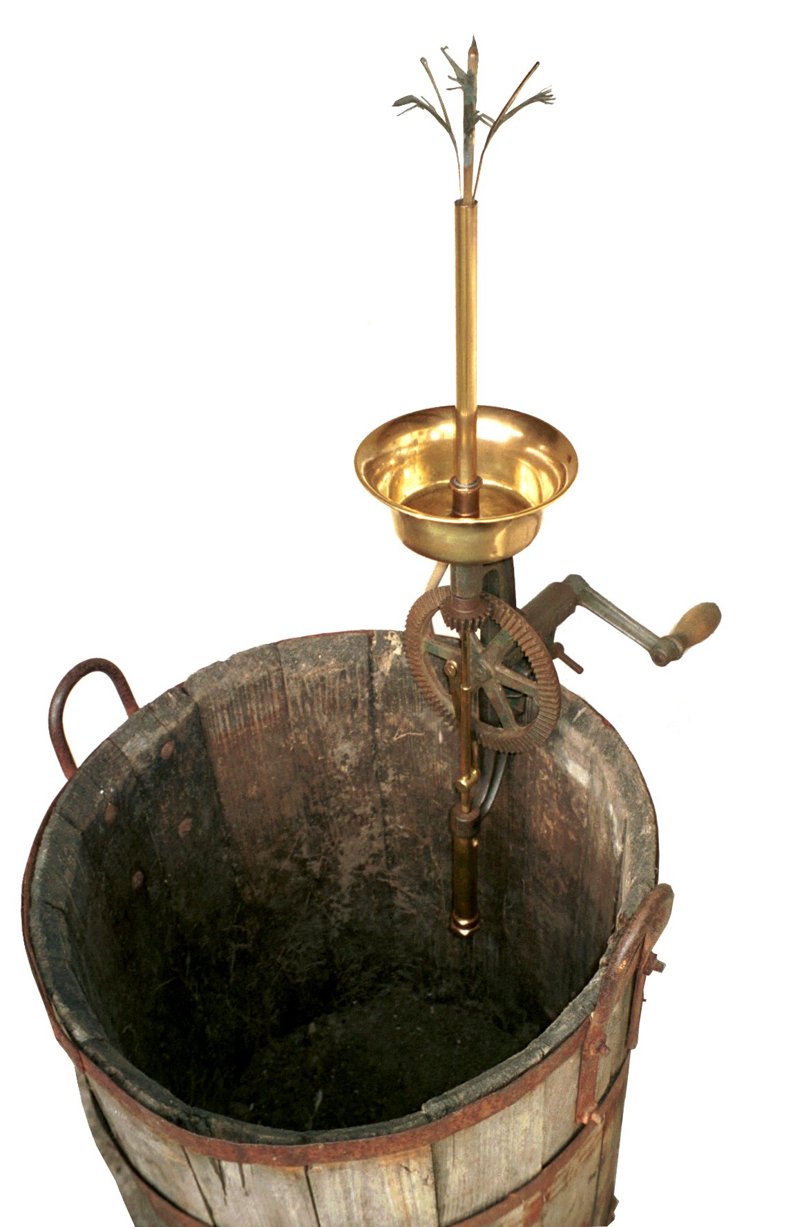 La manivelle entraîne dans son mouvement de rotation une roue à rayons, garnie de crans sur la face interne de sa circonférence, formant un engrenage en V avec un pignon placé à la partie supérieure du support. Ce pignon est relié par un tube à un goupillon laveur en fils de laiton à quatre bras, situé au sommet de l'appareil.