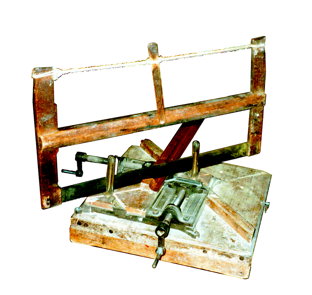 - Un socle, sur lequel sont fixés d'une part deux étriers en bronze (pour ne pas affecter l'avoyage), qui dirigent et maintiennent la lame de scie pour obtenir une coupe à 45 ; et d'autre part, deux étaux en fonte servant à maintenir la moulure à couper.
