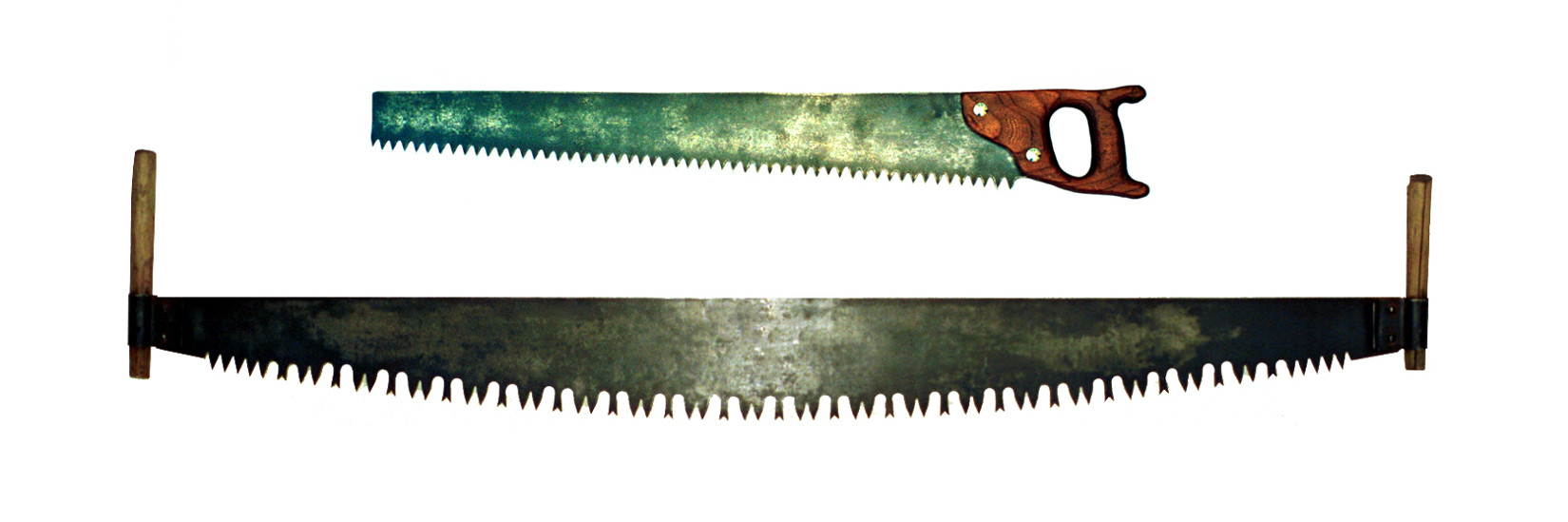 - soit manœuvrées à deux (tire-pousse), avec une lame à deux manches courts à chaque extrémité : c'est le passe-partout ;