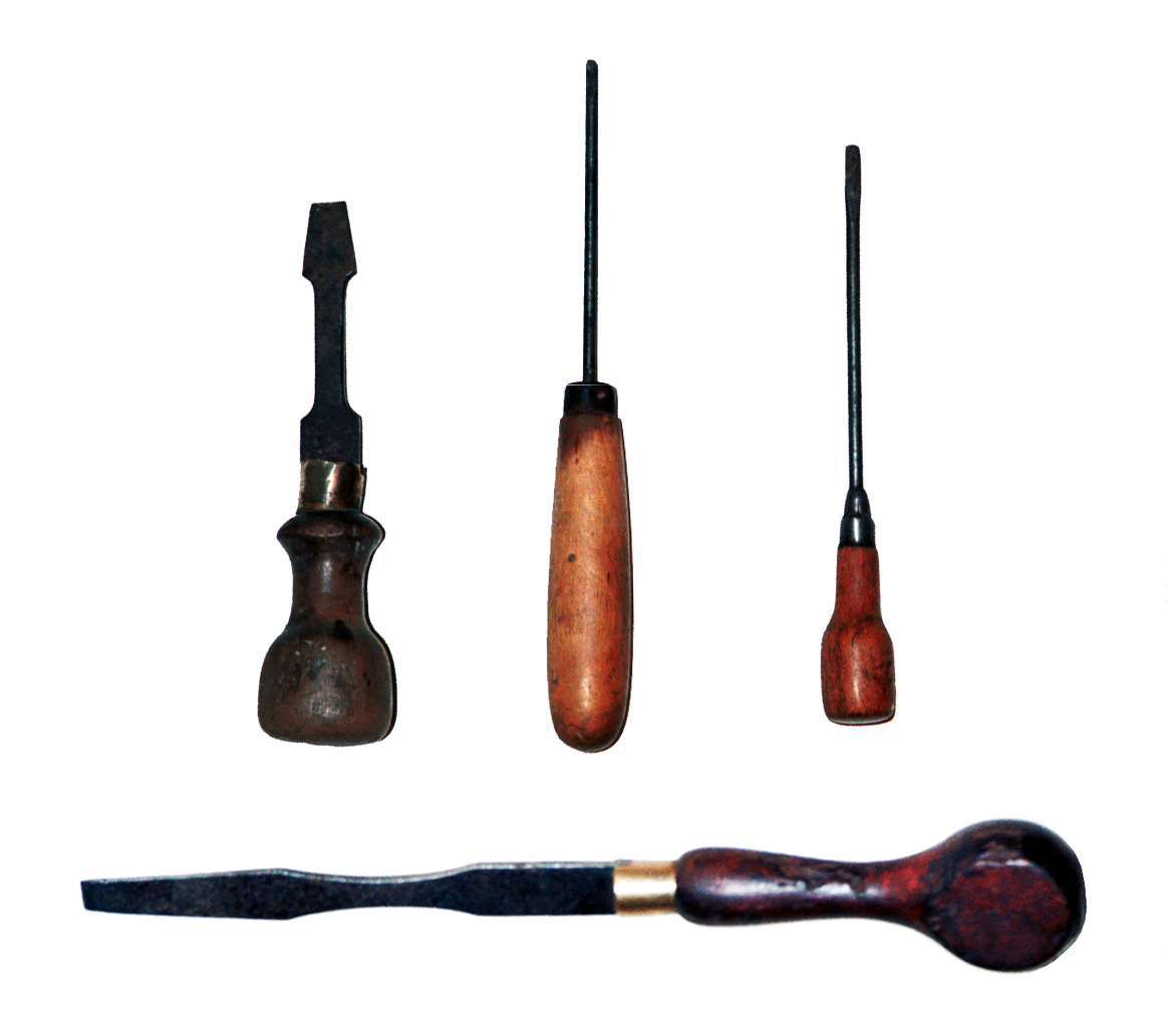 Dans le tournevis, l'effort de torsion est intense et tend à dissocier le fer du manche. Bien qu'à partir du XXème siècle le tournevis soit devenu un objet de quincaillerie, les artisans ont souvent préféré continuer à le façonner eux-mêmes. Le manche est cylindrique et à cannelures, ou, ce qui est préférable, de section ovale. D'une façon générale, le relief du manche est toujours accentué pour permettre une saisie très sûre et très puissante de la main.