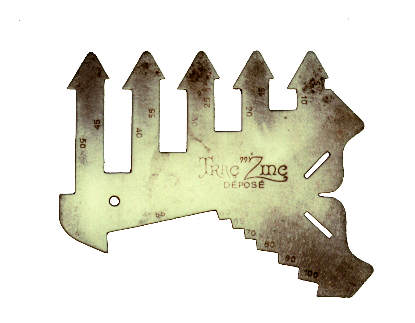 Contrairement au trusquin qui est réglable, la tracette ne permet de faire des tracés que de 5 en 5 millimètres jusqu'à 65 millimètres, puis de 10 en 10 jusqu'à 100 millimètres. L'épaulement qui s'appuie sur le bord de la pièce ainsi que la pointe à tracer sont établies de façon définitive par la découpe de l'outil, lui donnant cet aspect insolite.